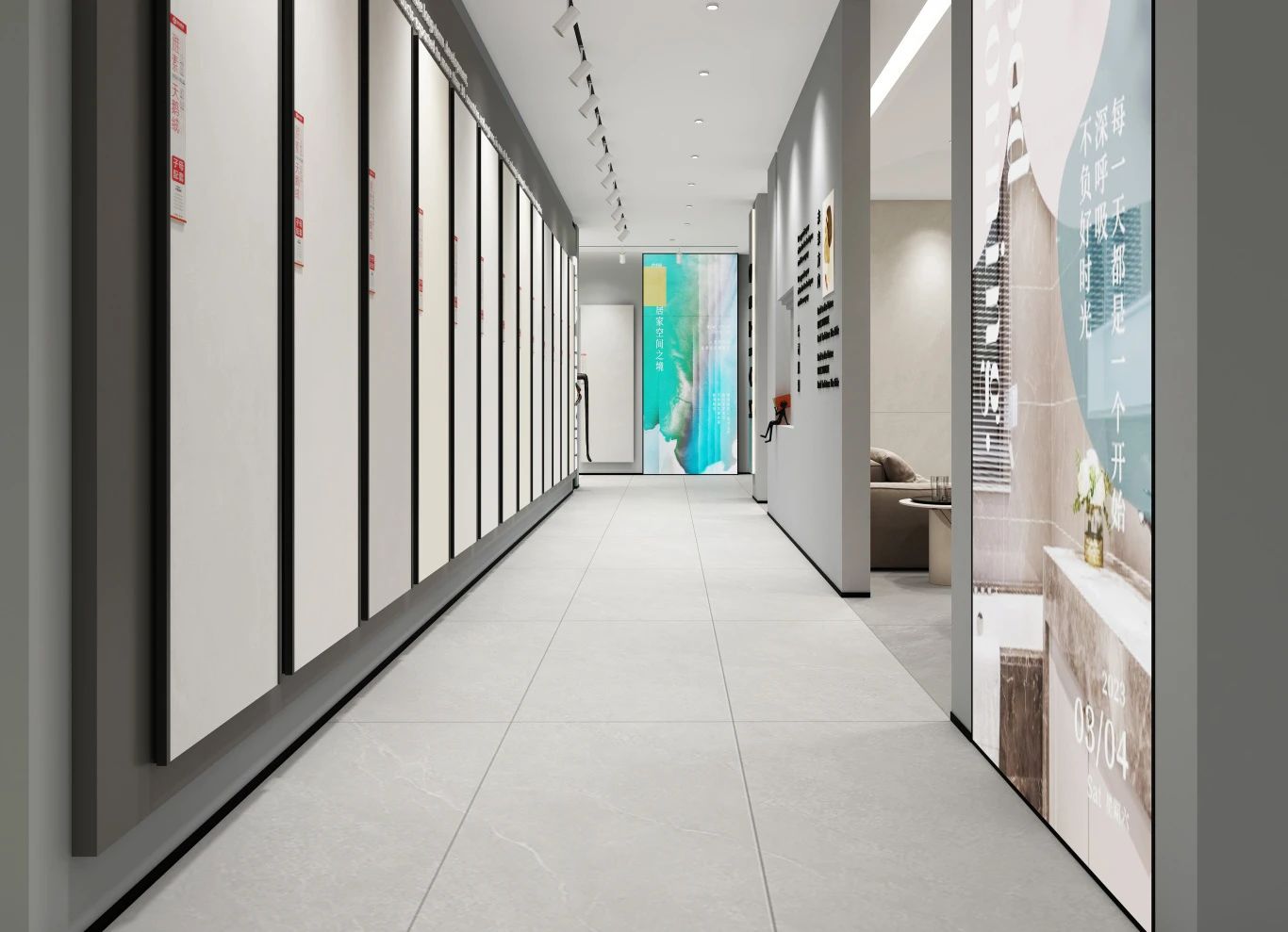 同時我們以前瞻性思維、多樣化的展陳方式,根據不同產品的特點、紋理、質感、規格劃分出相應的展示區域,讓進店客戶短時間內高效發現和體驗到產品的魅力。